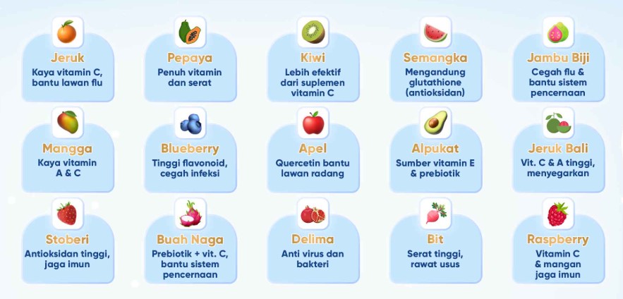 Buah adalah sumber vitamin dan nutrisi penting bagi anak-anak. Dengan rutin mengonsumsi buah, anak-anak dapat meningkatkan daya tahan tubuh, mendukung pertumbuhan dan perkembangan, serta menjaga kesehatan pencernaan. Menjadikan buah bagian dari pola makan sehari-hari adalah langkah sederhana namun efektif untuk mendukung kesehatan anak secara menyeluruh.