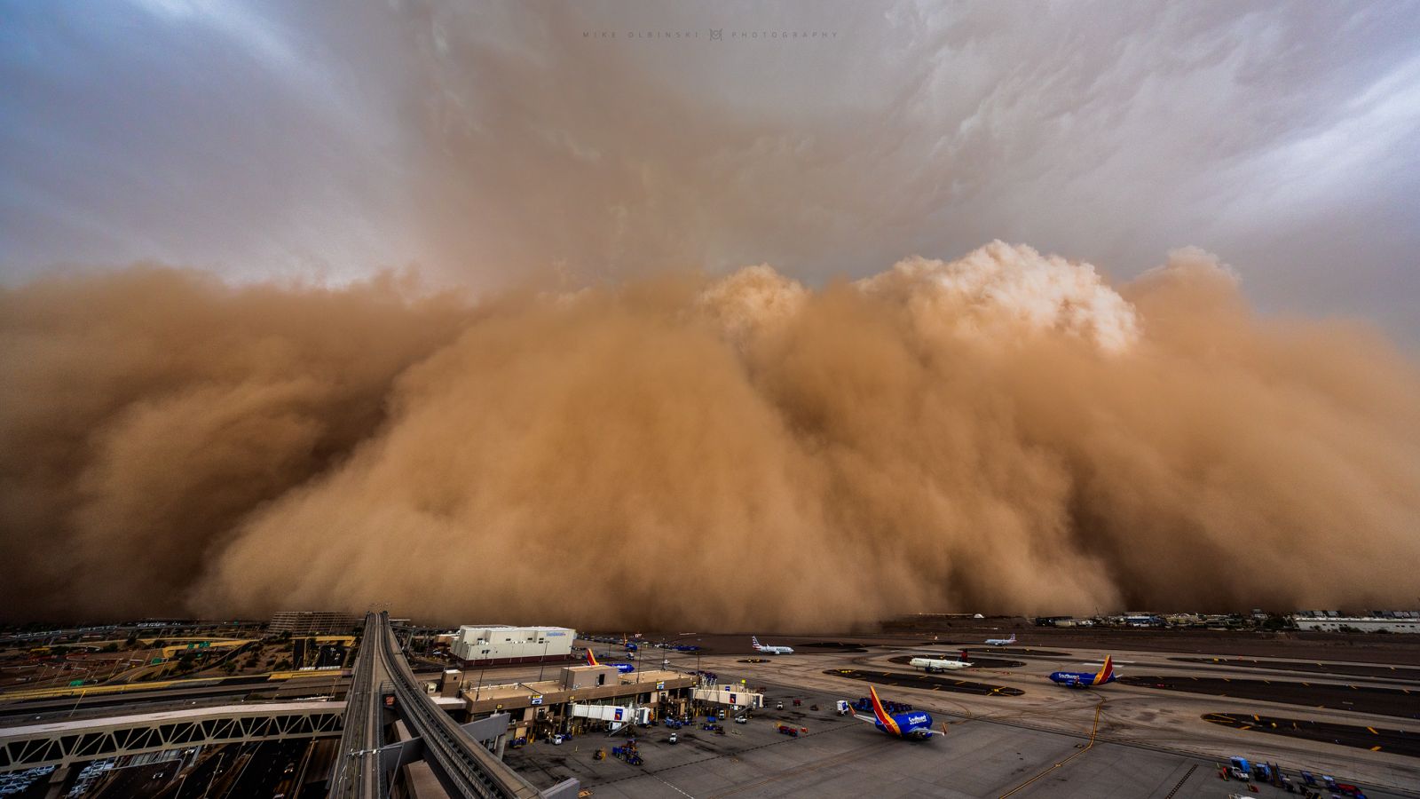 Angin kencang membawa debu tebal hingga menutupi jalan raya dan bangunan. Banyak penerbangan terpaksa dibatalkan karena jarak pandang yang sangat terbatas.